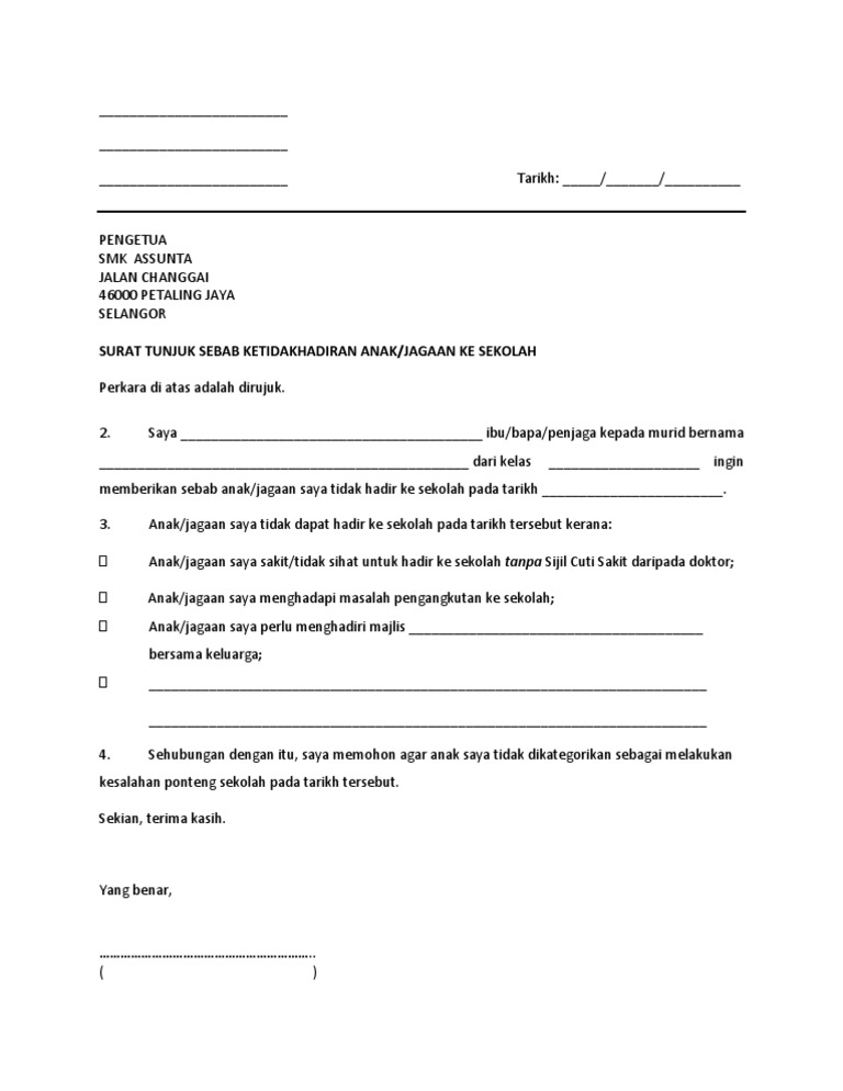 Contoh Surat Kiriman Rasmi Tunjuk Sebab Tidak Hadir Ke Sekolah - Download Kumpulan Gambar from gambarstatus.com 13 inspirasi contoh surat izin resmi dengan mudah kumpulan. Contoh surat izin sakit ini bisa kamu gunakan untuk keperluan tidak masuk sekolah, kuliah, atau pun kerja. Surat cuti sakit biasanya harus dilengkapi dengan surat keterangan dari dokter atau rumah sakit yang menjelaskan tentang kondisi karyawan tersebut. Berikut disertakan contoh surat rasmi memohon cuti daripada pihak sekolah sekiranya pelajar tidak menghadirkan diri ke sekolah tanpa sijil sakit ataupun atas alasan lain yang kukuh atau munasabah. Untuk itu kami akan memberikan jawaban dan contohnya dalam pembahasan kali ini. Contoh surat permohonan cuti sakit. Dalam artikel ini, glints telah menyiapkan empat contoh surat cuti kerja, yang terdiri atas cuti tahunan, sakit, melahirkan dan berduka. Surat permohonan cuti sakit adalah surat yang dikeluarkan untuk menyatakan bahwa yang bertanda tangan dalam surat meminta izin karena sakit.